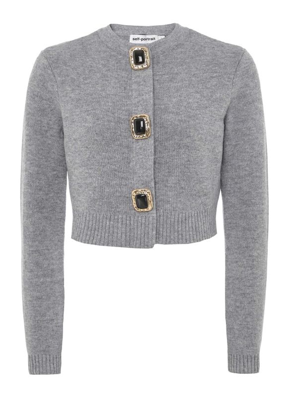 Enjoy style and comfort in the Grey Wool Cardigan by Self-Portrait. Crafted from a soft wool blend, this Self-Portrait cardigan is a cropped style with a round neckline, long sleeves and a ribbed hem and cuffs. It has a concealed button closure to the front and is embellished with faux vintage-inspired gold & black buttons. It's the perfect knit for a flattering fit, whether worn with jeans, wide-leg trousers or a mini skirt.