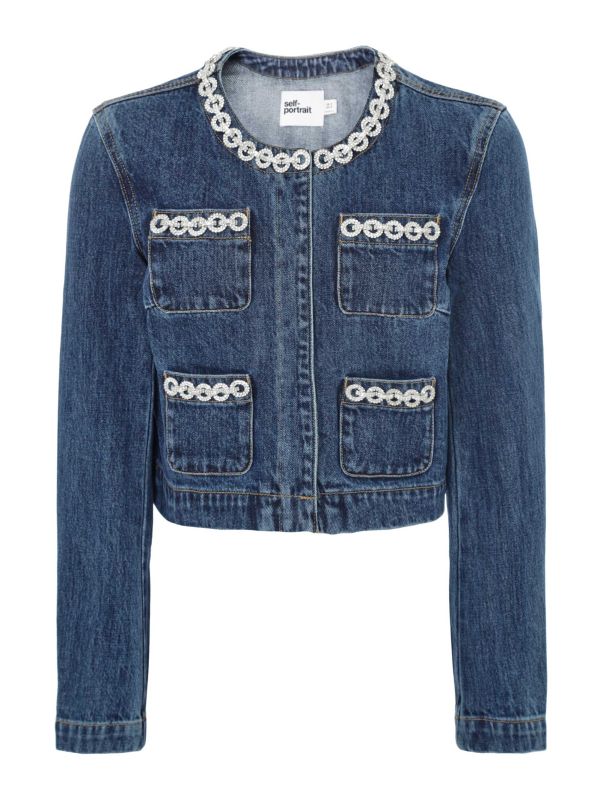 Embrace the sparkle of the Self-Portrait Crystal Trim Denim Jacket. This Self-Portrait jacket combines the features of a classic denim jacket with elevated details, delivering a standout piece you can dress up or down. Cut from 100% cotton with a cropped fit, it features a collarless neckline and four functional pockets decorated with crystal chain trims.