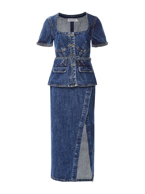 The Denim Midi Dress from Self-Portrait is a two-piece design that joins with an internal button closure to create a midi-length dress. The top has a square neckline, peplum waist, short sleeves, button closure, two faux flap pockets and a matching removable waist belt. The skirt has a zip fastening to the back and features a front split to the side. Wear these pieces together or apart for several stylish looks.