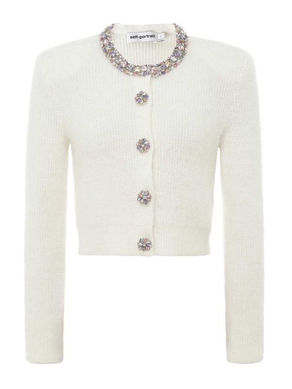 Self-Portrait's Embellished Trim Cardigan is crafted from a luxurious alpaca-wool blend, offering a super soft handle. It has a cropped cut and features a sparkling diamanté trim neckline and faux flower button embellishments down the front, concealing the button closure. Wear this Self-Portrait cardigan to uplift your casual looks or style it for a night out.