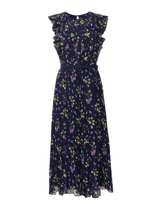 Slip into style with the Floral Chiffon Midi Dress in navy from Self-Portrait. Crafted from a breezy chiffon fabric, this midi-length dress has a pretty pleat design with a ruffled bodice and floaty skirt. Covered in a delicate floral print, this dress comes with a removable belt to cinch the waist and create an elegant, feminine silhouette.