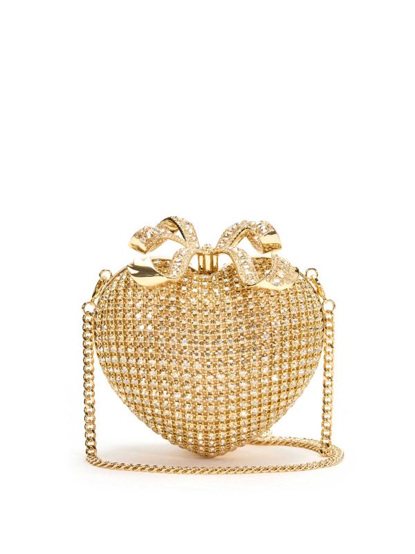 Steal the show with the Self-Portrait Gold Crystal Heart Clutch by your side. The ultimate head-turner, this gorgeous Self-Portrait clutch bag is heart-shaped and gold crystal-studded. It's topped off with an embellished bow and comes with a removable chain shoulder strap. Whether attending a wedding or a milestone birthday party, this bag will be your trusted companion.