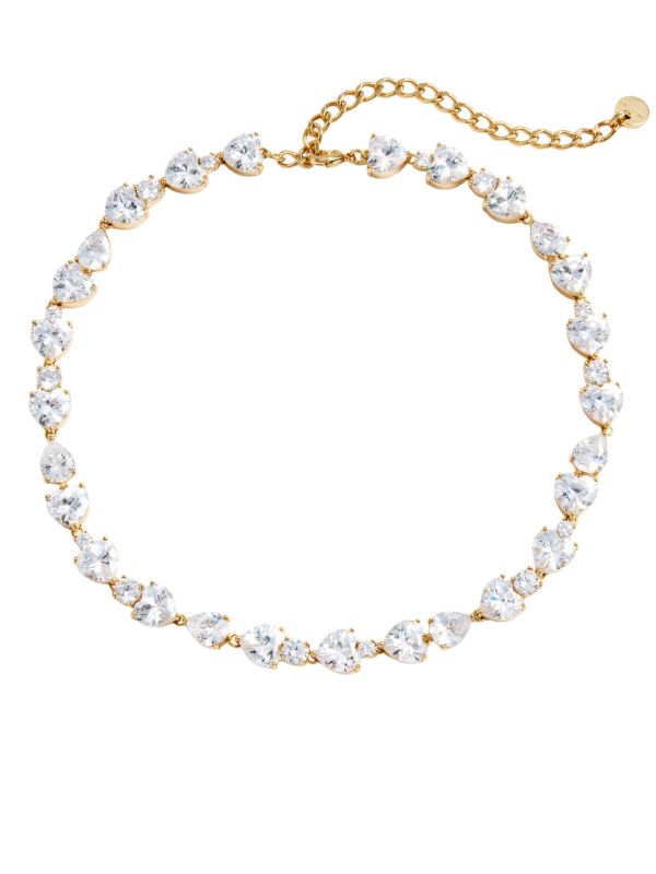 The Gold Heart Crystal Necklace from Self-Portrait is a close-fit strand of alternating heart and round-cut stones set in a metal frame. Designed to sit at the collarbone, it fastens with an adjustable extender finished with a branded charm for a personalised fit. Its clean-lined construction creates a neat silhouette that complements tailored separates and softer evening fabrics. Supplied in a branded box, wear it alone or paired with coordinating earrings for a matched set. Ideal for gifting, the necklace brings a polished finishing touch to celebratory outfits.