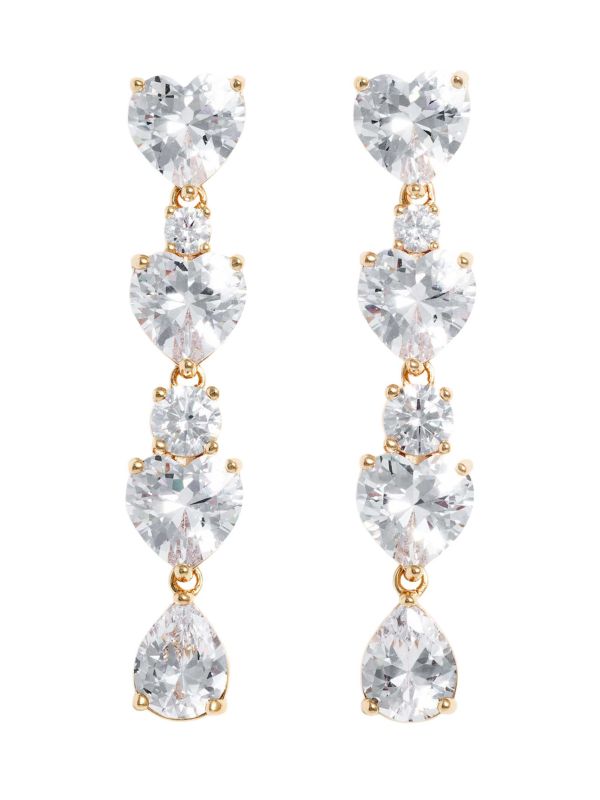 These Gold Heart Crystal Tiered Earrings from Self-Portrait feature a cascading line of five linked stones in heart, round and pear shapes, set in a gold-tone metal frame. The drop design fastens with a post and silicone disc for secure wear, and the reverse is engraved with the brand. Supplied in a branded box, these long earrings add a sparkling finish to evening looks and can be worn for special occasions. Pair with tailored separates or a simple dress for balance.