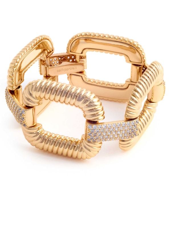 Dress to impress with the Gold Knocker Bracelet by Self-Portrait, a sparkling statement piece sure to stand out, whatever your outfit. This gold Self-Portrait bracelet features an oversized silhouette with square-shaped loops connected by silver crystal links. Wear it to dazzle in your day looks or save it for special occasions when it's time to dress up.