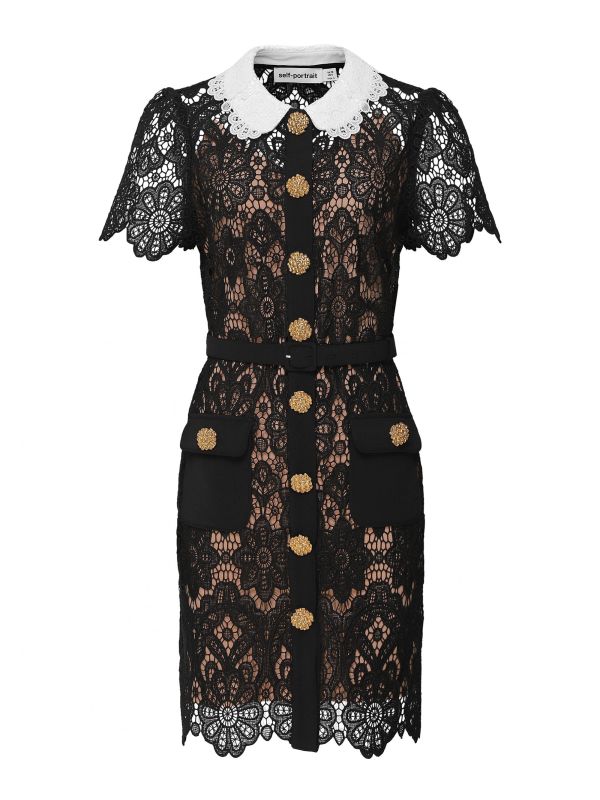 A quirky take on the 'LBD' the Self-Portrait dress. Expertly crafted from floral guipure lace fabric, the dress has been cut to a mini length with an a-line silhouette. Featuring a flared skirt, a statement button fastening and two patch pockets to the front, the dress is complete with a unique contrasting collar. Style yours with heels and be the talk of your next party.