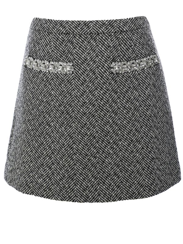 Enjoy a preppy look with the new season herringbone mini skirt from Self-Portrait. This timeless mini skirt is crafted from a wool blend and features a classic herringbone pattern throughout. It has a fitted style and a subtle A-line shape, closing with a zip at the back. Complete with diamanté trims on the faux pockets, this skirt can be dressed up or down, whatever the occasion.