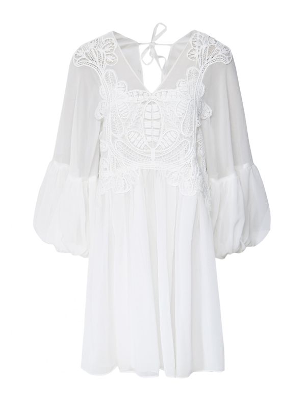 The Self-Portrait Georgette mini dress will add a super flattering and feminine touch to your evening looks. Beautifully crafted from georgette fabric, the dress has been cut to a mini length. With a macrame trim to the bodice, full balloon sleeves and a tie detail to the back, the dress is complete with adjustable ties to the waist allowing you to create a cinched silhouette.