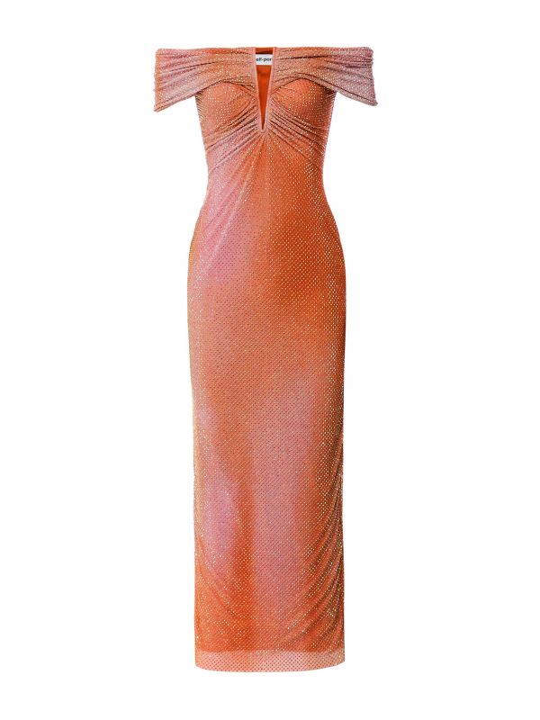 The Self-Portrait Printed Mesh Rhinestone Midi Dress is the ultimate party dress. Crafted from a polyester-elastane blend, this sleek body-hugging dress is an off-the-shoulder style with a structured bodice and deep V neckline. Featuring pink and orange printed mesh and scattered all over with shiny rhinestones, this dress is ideal when you want to dazzle.