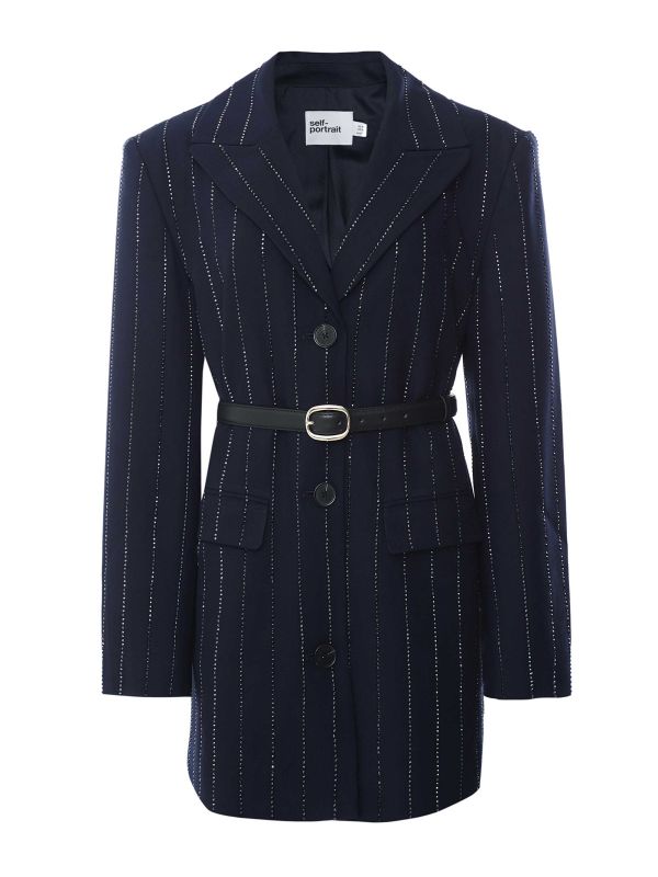 Elevate any look with the Self-Portrait Rhinestone Pinstripe blazer. Featuring a button closure at the front, shoulder pads, flap pockets and a removable leather belt to cinch the waist, finished with dazzling rhinestone pinstripes. Cut for a relaxed fit, this Self-Portrait blazer can be styled as a jacket or as a dress alternative.