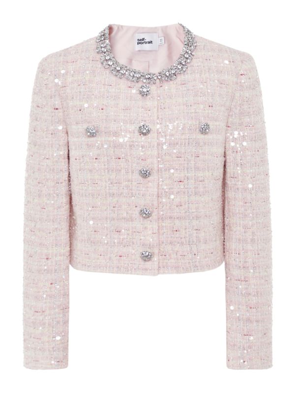 The Sequin Bouclé Jacket from Self-Portrait is a cropped, boxy jacket in sequin-embellished bouclé. It features a jewel-encrusted round neckline, crystal-cluster buttons down the front and a fully lined interior. Long sleeves and slight shoulder shaping create a structured silhouette that layers neatly over shirts or knitwear. Hand-applied sequins and beadwork add textured shimmer without overwhelming the design, while the short length sits at the waist for contemporary tailoring. Perfect for dressing up Pants or skirts, it brings a polished edge to both evening and daytime looks.