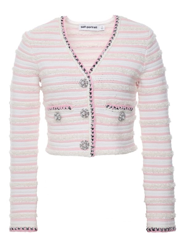 Complement your evening looks or make a statement with your everyday ensemble with the Self-Portrait cardigan. Beautifully crafted from a luxurious wool blend, the cardigan has been cut to an on-trend cropped length. With two snap button pockets to the front and braided trims, the cardigan is complete with striking pearl and diamante buttons at the fastening.