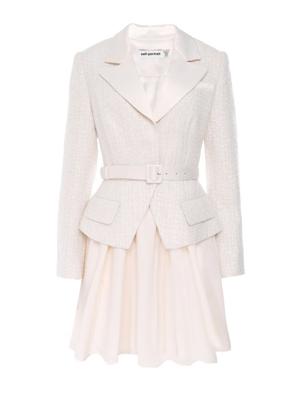 Stand out in the striking Self-Portrait tailored mini dress. Beautifully crafted from metallic boucle, this dress boasts a tailored jacket at the top with an attached flared skirt. Featuring long sleeves with four buttons to the cuffs, the dress is finished with a fabric belt to create a flattering shape. Style yours with a contrasting pair of heels for the ultimate evening ensemble.