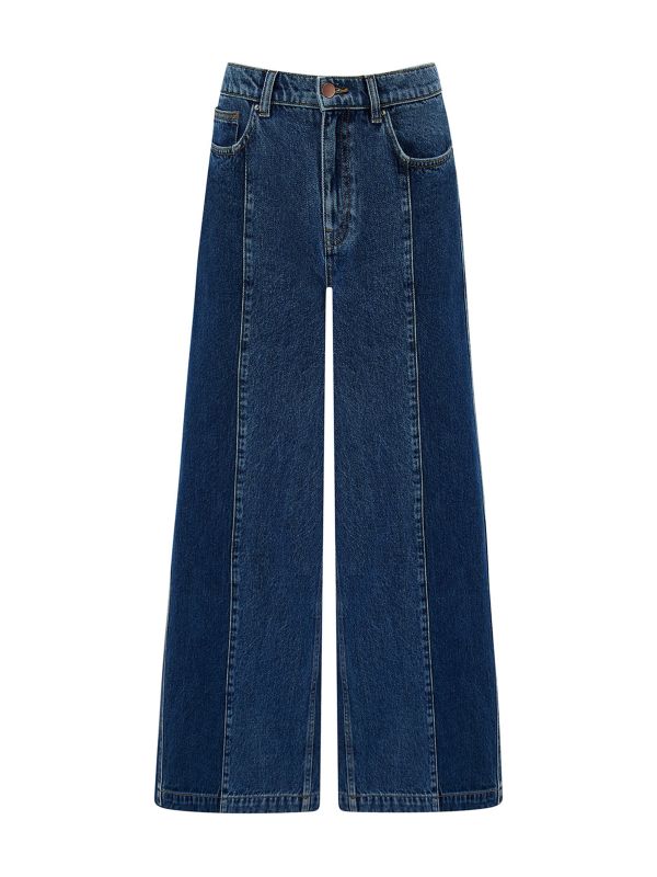 Seventy + Mochi's Bay Two Tone Jeans are the ultimate wide-leg style. Made consciously from a blend of organic cotton and recycled cotton, these rigid denim Seventy + Mochi jeans are a denim favourite for any wardrobe. Featuring a super high-rise waist, a super wide-leg with seams and a five pocket construction, they're intended to fall over the shoes for a classic look.