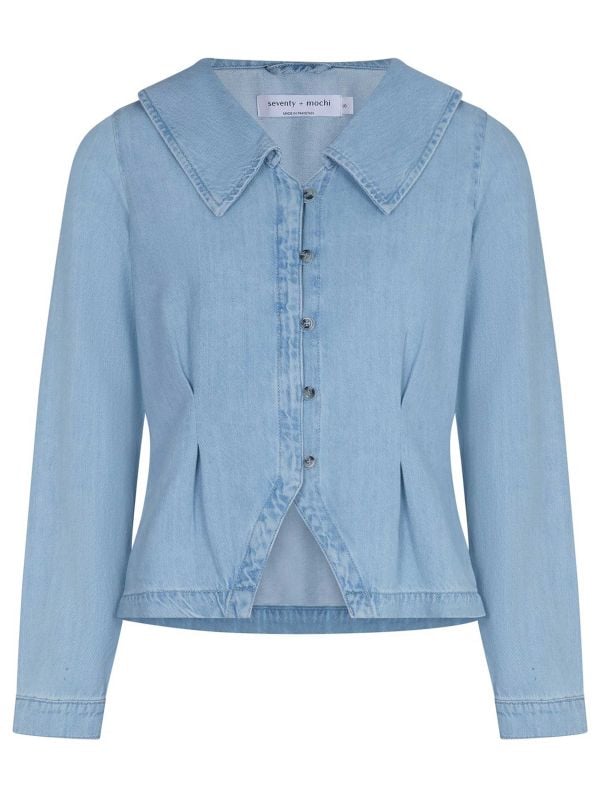 The Seventy + Mochi Bette Button Up Denim Shirt is a tailored button-through blouse with a distinctive wide pointed collar and long, cuffed sleeves. Shaping darts define the waist for a sculpted silhouette, while a subtle V-shaped front vent adds movement to the hem. The shirt fastens with tonal buttons and features clean, panelled seams for an architectural finish. Wear it tucked into high-rise jeans or layered under a blazer for crisp daytime tailoring and relaxed evening looks.