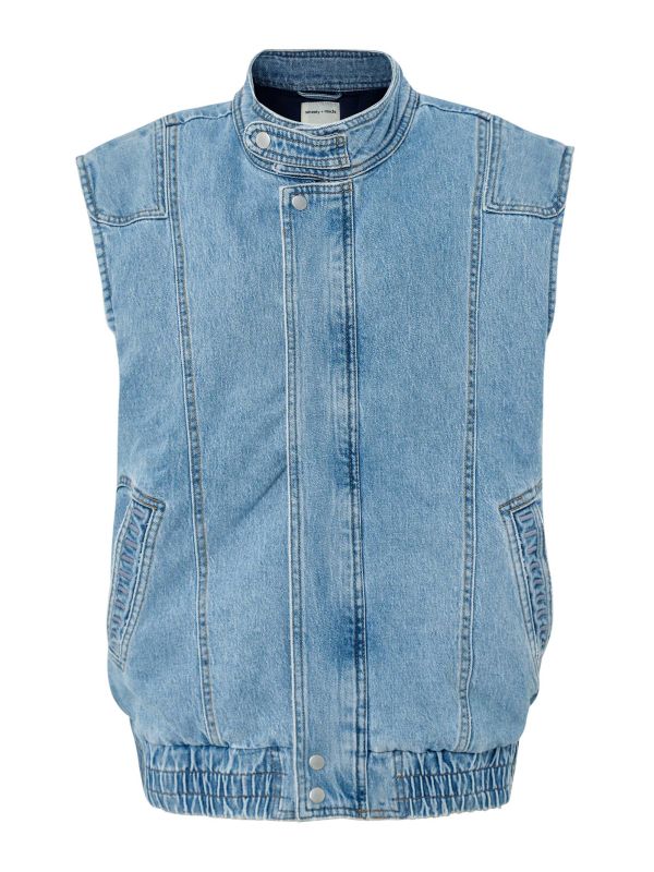 Meet the sleeveless version of the beloved Juno jacket by Seventy + Mochi. A retro bomber jacket style, this Seventy + Mochi jacket is designed for an oversized fit with a high collar, concealed zip closure, button clasps and an elasticated hem. It's finished with slanted pockets.