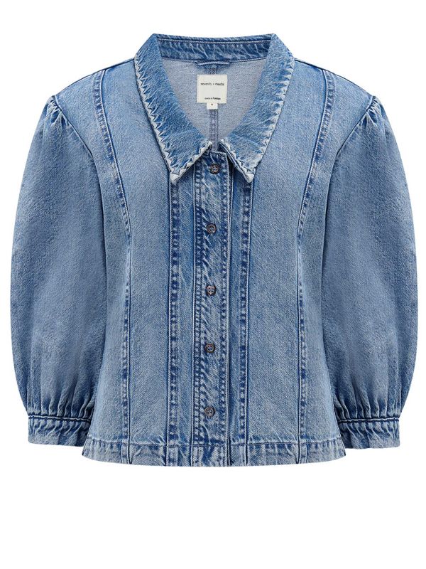 Seventy + Mochi's Talia Top is a chic day-to-night blouse crafted from 100% cotton. Featuring a chelsea collar, elbow-length puff sleeves, a button-down front and seam details, this Seventy + Mochi top is a versatile piece with endless styling potential. Create a double-denim look with jeans or dress it up with a midi or mini skirt.