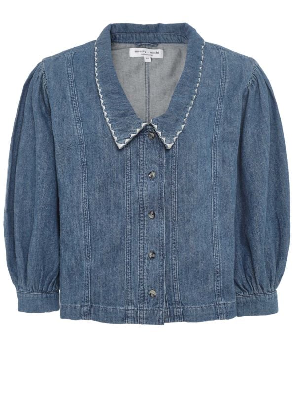 The Seventy + Mochi Talia Collared Denim Top is a relaxed, shirt-style silhouette with vertical panel seams and a pointed collar edged with zigzag trim. It fastens with front buttons and has softly gathered, three-quarter sleeves that finish at fitted cuffs. The straight hem sits at the hip for easy layering over Pants or a mid-length skirt. Subtle seaming adds a tailored look while maintaining a relaxed feel, making it versatile for daytime dressing and transitional seasons.