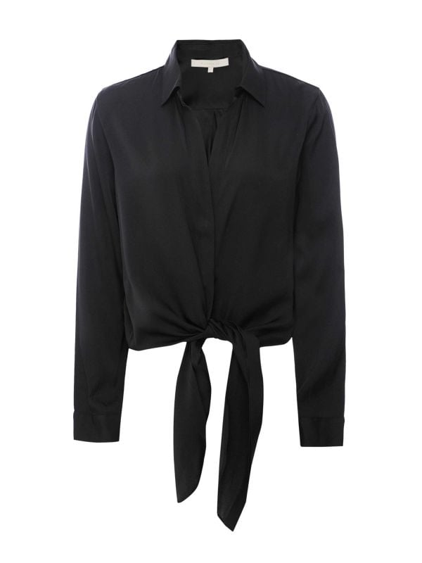 The Silk95Five Thai Top is a luxurious modern blouse and a day-to-night staple piece. Designed to fit like a button-down, this soft blouse crafted with 95% silk has a low V neckline, long sleeves, a tie front and dipped hemline. Style it with statement jewellery and a pair of tailored trousers.