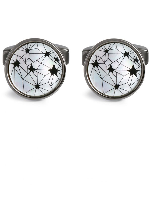 Elevate your formal accessories with the Simon Carter Galaxy cufflinks. Designed with an artistic geometric abstraction of galactic star formations, the cufflinks showcase a modern and dynamic aesthetic. Available in either mother-of-pearl or blue goldstone, each pair offers a luxurious and opulent appearance.