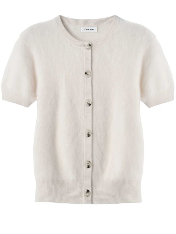 The Brushed Short Sleeve Cardigan by Soft Goat is a lightweight button-front layer with a neat round neckline and short sleeves. It features a soft, brushed knit surface crafted from 100% cashmere, ribbed trims at the neckline, cuffs and hem, and tonal round buttons that fasten through slim buttonbands. Cut for a slightly boxy silhouette, it sits at the hip for easy layering over dresses or Pants. A versatile piece for transitional weather, it offers a subtle, textural finish that complements both relaxed and smarter looks.