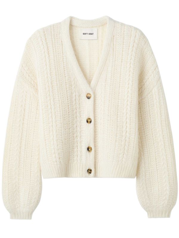 Soft Goat's Silk Knit Cardigan is a softly textured button-up designed for layered wear. It features a deep V-neck, tortoiseshell-effect buttons and an open ribbed knit that creates subtle transparency. Dropped shoulders and voluminous long sleeves gather into ribbed cuffs, while the ribbed hem offers gentle structure. Fine openwork stitching gives a soft halo and textured depth to the fabric, making it a versatile piece for cooler evenings or transitional months.
