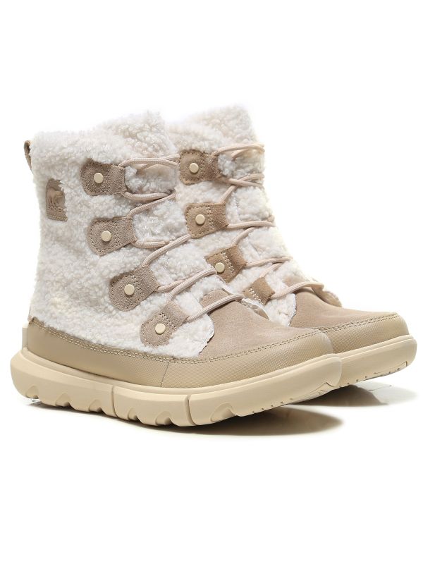 The Sorel Explorer II Joan boots combine the lightness of a sneaker with cosy weather protection. Expertly engineered in premium suede with faux shearling, the boots have been given a seam-sealed waterproof construction to keep your feet dry from the snow and rain. Featuring a hook lace fastening and insulated microfleece lining, whilst the sturdy EVA tread outsole provides exceptional comfort and traction.
