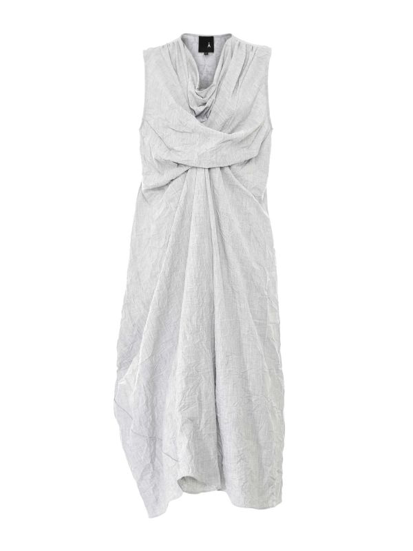 Discover the Malan Drape Maxi Dress by Sort Aarhus, a sculptural maxi shaped by a twisted knot at the front and a relaxed cowl neckline. Sleeveless and cut in a loose column silhouette, the dress falls to an ankle-length hem with a subtle asymmetric drape. The design slips on with no visible fastenings and shows a crinkled textured surface that adds movement. Wear it with sandals or layered Jewelry for a considered daytime look.