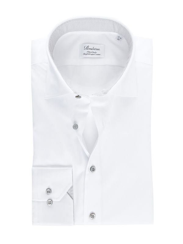 Designed in a fitted silhouette, it features a moderate cut away collar, French placket, and elegant mother-of-pearl buttons for a timeless look. The contrast lining at the collar and cuffs adds a discreet pop of character, making the Stenströms shirt a versatile choice for both business and occasion wear.