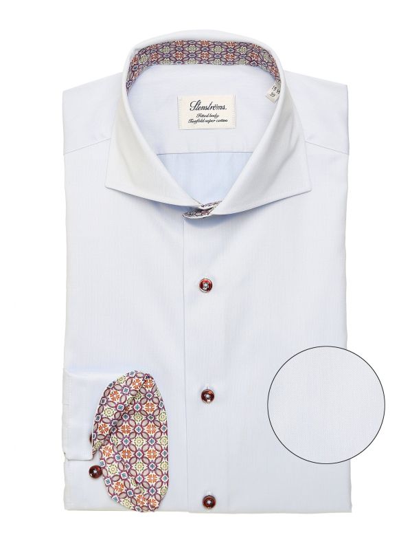 Elevate your business wear with the Stenstroms geometric trim shirt. Cut to the label's fitted body and crafted in twofold super cotton, the shirt offers a contemporary silhouette and exceptional drape and lustre. Featuring a cut away collar, adjustable cuffs and contrast mother-of-pearl buttons, whilst the vibrant geometric patterned linings lend playful detail synonymous with the Swedish shirtmakers.