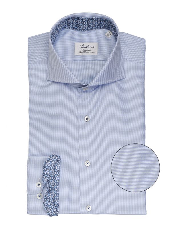 The Stenstroms micro houndstooth shirt is set to give your professional attire a luxe upgrade. Lovingly tailored to a fitted body and crafted in twofold super cotton, the blue shirt lends a contoured silhouette and exceptional drape and lustre. Featuring a cut away collar, adjustable cuffs and iridescent mother-of-pearl buttons, whilst the micro houndstooth pattern is contrasted with geometric linings offering charming detail.