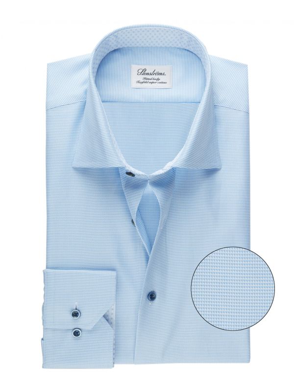 Sharpen up your business attire with the Stenstroms micro pattern shirt. Lovingly tailored to a fitted body and crafted in twofold super cotton, the blue shirt lends a contoured silhouette and exceptional drape and lustre. Featuring a spread collar, adjustable cuffs and tonal mother-of-pearl buttons, whilst the geometric floral linings add charming character synonymous with the Swedish shirtmakers.