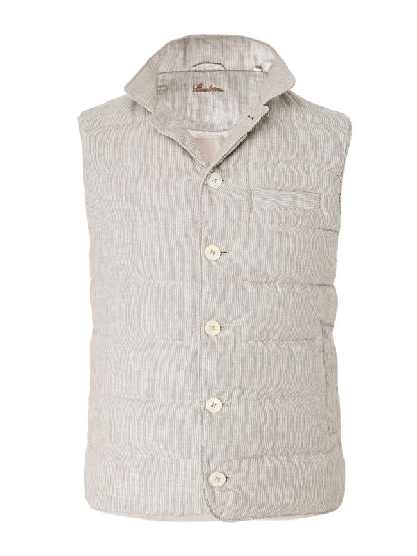 Add versatile layering to your summer attire with the Stenstroms striped gilet. Expertly engineered in premium linen with a quilted down filling, the gilet offers exceptional insulation without compromising on essential breathability. Featuring a stand collar with button-through fastening, three pocket front and lined interior, whilst the pinstripe pattern makes for a charming aesthetic.