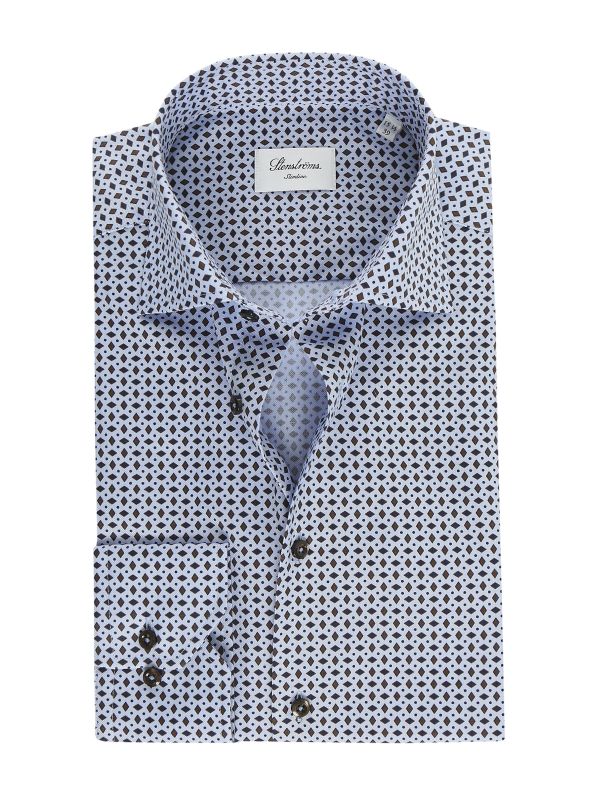 The Stenstroms diamond print shirt epitomises elegance and sophistication with its meticulous craftsmanship and attention to detail. Crafted from twofold super cotton, it exudes unparalleled comfort and durability. The shirt features a semi cut away collar and a refined French placket, adding a touch of modernity to its classic design.