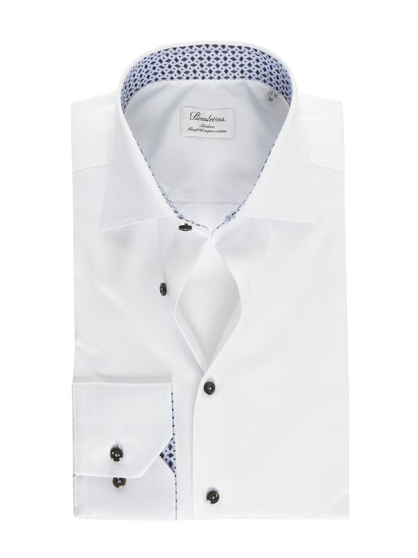 The Stenstroms diamond print trim shirt epitomises elegance and refinement with its meticulous craftsmanship and attention to detail. Crafted from twofold super cotton, it exudes luxury and comfort simultaneously. Its semi-cut away collar adds a modern flair while maintaining a timeless appeal. The French placket lends a sophisticated touch, enhancing the shirt's sleek silhouette.