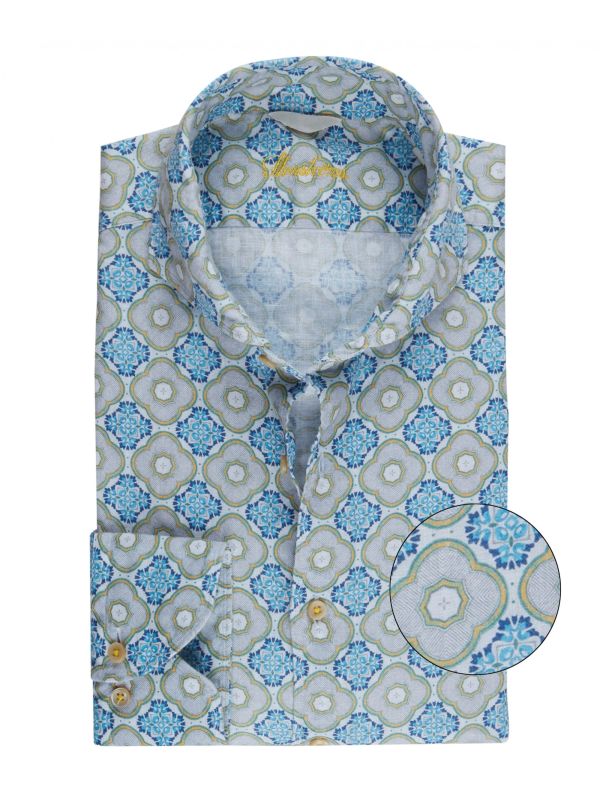 Showcase lively print this summer with the Stenstroms geometric print shirt. Expertly tailored in premium linen with a slimline cut, the shirt is the perfect choice for warm weather dressing. Featuring a cut away collar, adjustable cuffs and tonal pearlescent buttons, whilst the geometric floral pattern lends flamboyant character synonymous with the Swedish shirtmakers.