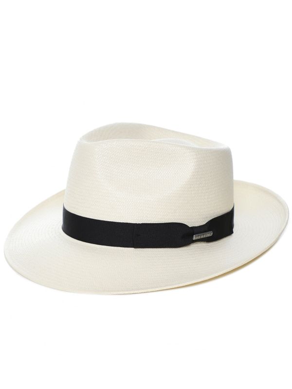 The Stetson Toyo Traveller hat is the perfect option for your warm weather vacation. Expertly crafted from a woven Toyo straw, the cream fedora offers a smooth touch and a super lightweight handle. Featuring a pinch front crown, interior herringbone sweatband and a traditional grosgrain hat band in contrast black, whilst the Stetson hat is complete with a metal brand badge for an authentic finishing touch.