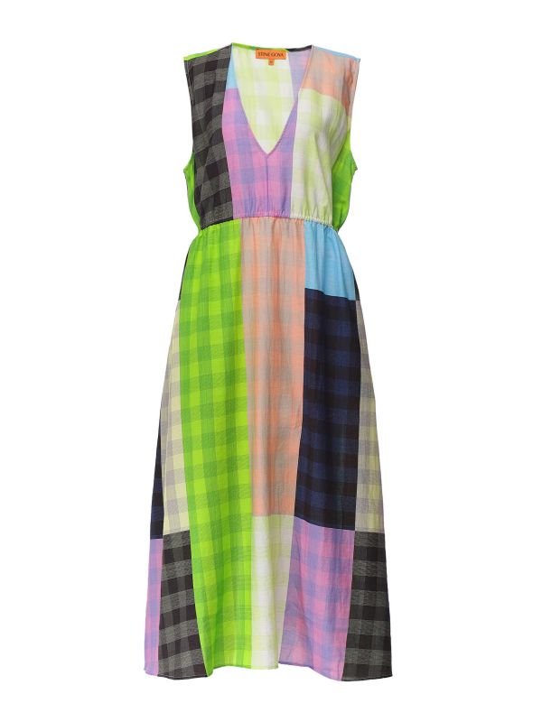 The Stine Goya Annalie dress is a striking summer piece with a flattering V-neck and elasticated waist. Sustainably crafted with environmentally-friendly materials, this versatile dress has a sleeveless silhouette and a bold patchwork check pattern throughout.