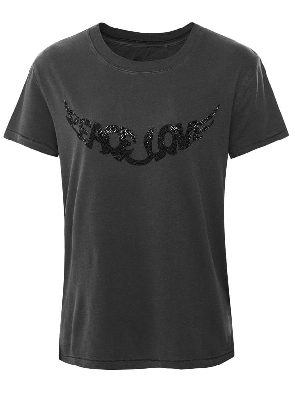 The Zadig & Voltaire Walk Peace & Love t-shirt adds a touch of glam to your wardrobe. This soft t-shirt is made from 100% cotton from organic agriculture and has a round neckline and short sleeves. To the front is a wing-shaped "Peace & Love" slogan embellished with black diamantés that catch the light. Style it with black or blue denim.