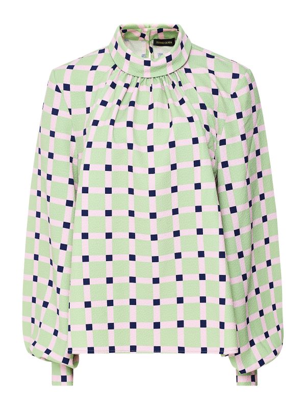 The Stine Goya Ashley blouse showcases bold pattern and a strong silhouette. Crafted in a recycled polyester with stretch, the shirt offers a loose, flowing fit. Featuring a stylish high turtleneck and stunning voluminous long sleeves, with the 'Lilac Graphic Check' pattern delivering the label's new season inspiration that explores subversive perspectives and powerful print.