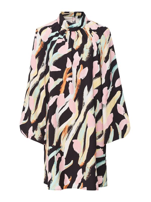 The Stine Goya Solaries dress showcases bold pattern and a strong silhouette. Crafted in a recycled polyester with stretch, the mini dress offers a flowing fit. Featuring a stylish high turtleneck and stunning voluminous long sleeves, with the 'Night Blooming Tree' and 'Lilac Graphic Check' patterns delivering the label's new season inspiration that explores subversive perspectives and powerful print.