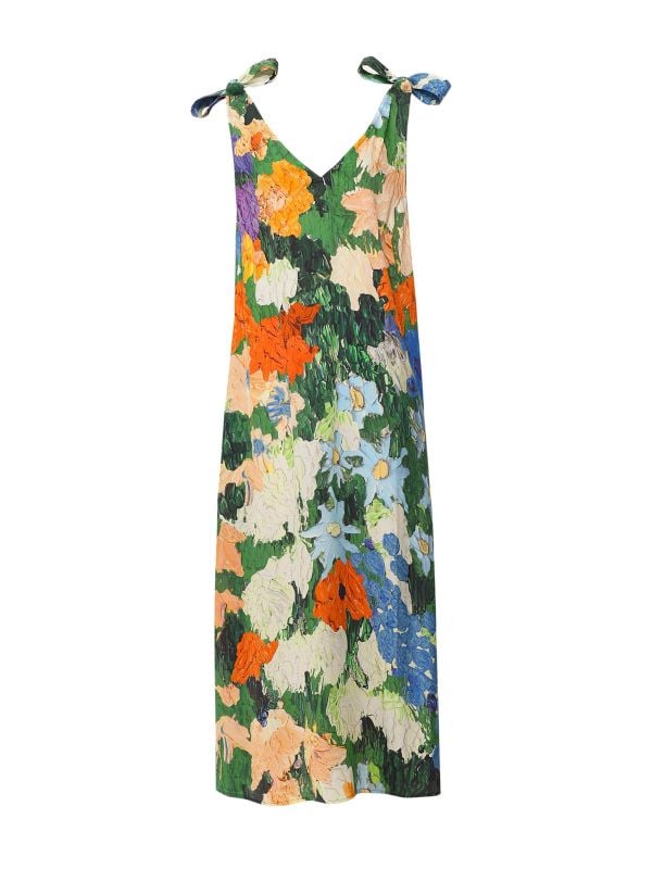 Make a statement this season with the Stine Goya Naomi dress. Responsibly crafted in a lightweight lyocell blend, this flowing midi dress features a V-neck, wide adjustable straps with bow fastening and a beautiful 'Impressionist Garden' print that's perfect for spring/summer.