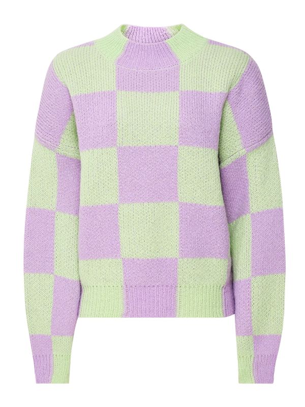 The Stine Goya Adonis sweater showcases bold pattern and a strong silhouette. Crafted in Italy from an alpaca blend knit, the pullover offers a super soft handle and essential warmth. Featuring ribbed trims and dropped shoulders for a relaxed silhouette, with the 'Lavender Fog' check pattern delivering the label's new season inspiration that explores subversive perspectives and powerful print.