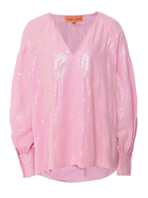 The Stine Goya Sandrine top is an elegant option that exudes the label's penchant for contemporary design. Crafted in an organic cotton blend, the blouse has been cut to a relaxed fit for an oversized, boxy silhouette. Featuring a plunging feminine V-neck with long voluminous cuff sleeves, whilst the subtle textured check pattern is beautifully accented with shimmering sequins throughout.