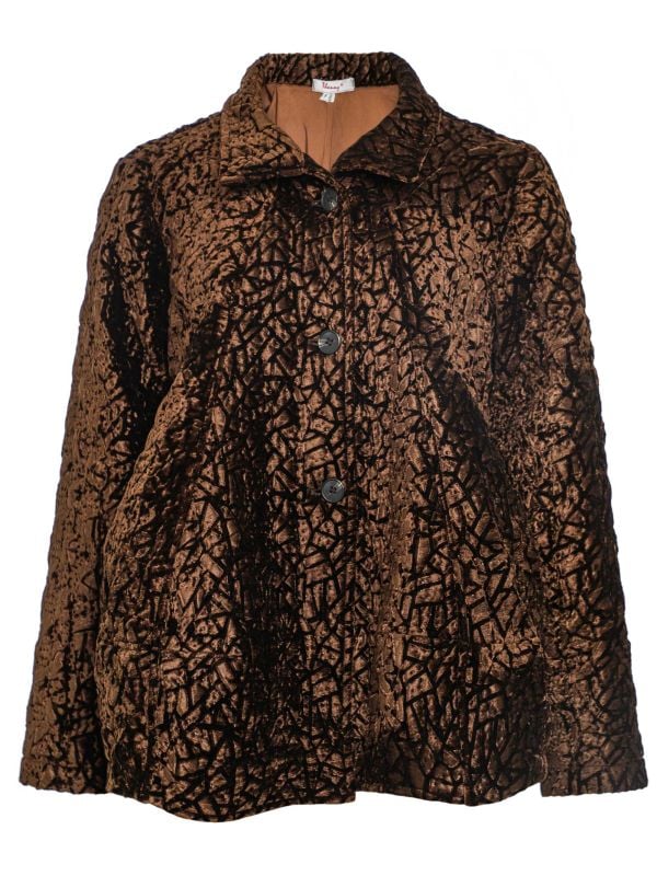 The Thanny Devoré Jacket brings tactile interest to evening and daytime wardrobes with its cracked devoré finish and sculptural surface. Cut with a shirt collar and single-breasted button fastening, it falls into a relaxed A-line shape that layers easily over knitwear. Fully lined for comfortable wear, the jacket features tonal buttons and a subtle swing hem for movement. Wear it with tailored trousers or a skirt to add textural contrast to an outfit. A versatile outer layer, it elevates seasonal looks with considered detailing.