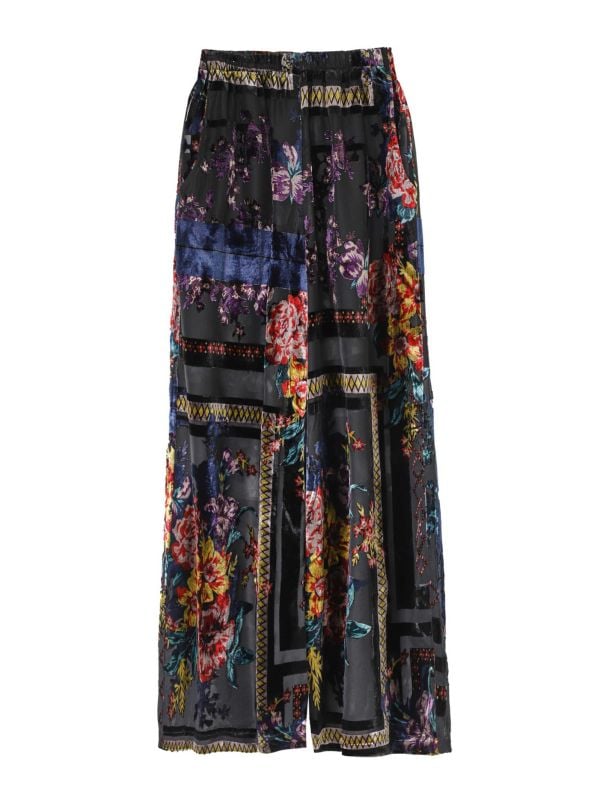 The Devoré Wide Leg Trousers by Thanny present panelled devoré burnout detailing across a relaxed, wide leg. Cut with an elasticated pull-on waistband and finished with side pockets, the mixed panels create depth and texture while maintaining an easy drape. Style with a fitted top and heels to lengthen the silhouette or pair with boots for a more grounded look; the versatile cut adapts well between dressed-up and casual ensembles.