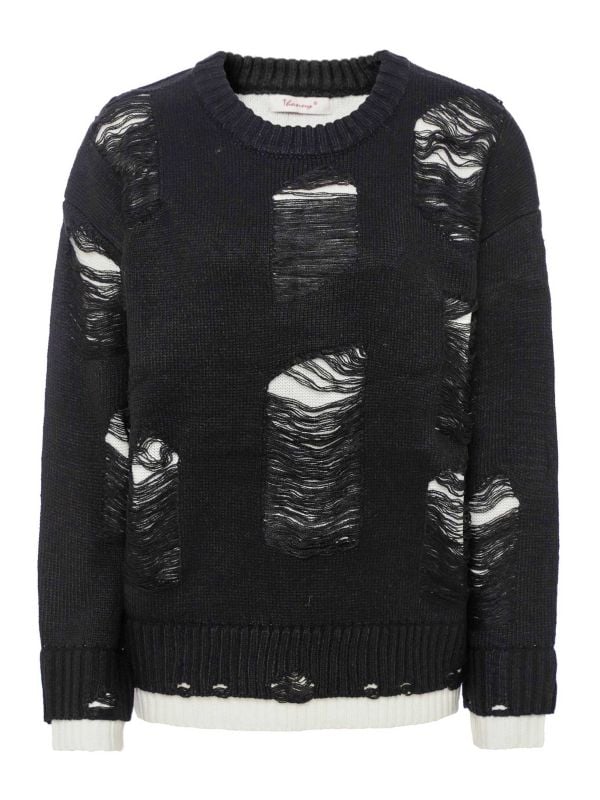 The Thanny Distressed Contrast Jumper reworks a crew-neck knit with deliberate openwork panels and abrasion detailing. Cut in a relaxed, easy shape, it has long sleeves and ribbed trims at the neck, cuffs and hem for structure. Distressed sections reveal an inner contrasting layer that peeks at the hem and cuff edges, adding depth and texture. Layer over shirts or wear alone as a focal knitwear piece that pairs with tailored trousers or denim for a contemporary, casual look overall.