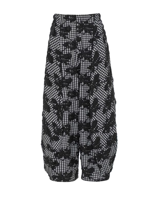 The Gingham Cropped Trousers by Thanny rework checked tailoring with a voluminous cropped silhouette. Panelled construction and visible vertical seams frame an all-over floral appliqué that introduces textured detailing across the garment. The gathered, tapered hems create a blouson effect while a flat waistband maintains a clean line. Made in Italy, these trousers can be worn with structured jackets or pared-back knits for a considered, directional approach to daytime or evening dressing.