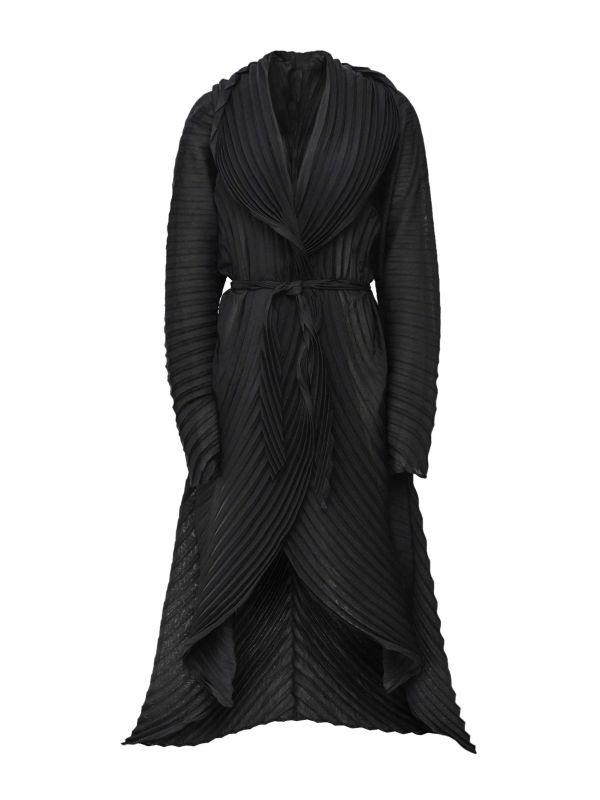 Turn heads in the Long Hooded Pleated Coat from Thanny. This longline coat is crafted from lightweight pleated fabric, offering a textured look that stands out. The coat has an open front that folds over at the top to create the look of an oversized collar. It has an attached hood, long sleeves, belt loops and a detachable self-tie belt that cinches the waist and enables the coat to close. With its long, floaty look, this coat is ideal for styling over slip dresses for an evening look or a pair of jeans on casual days.