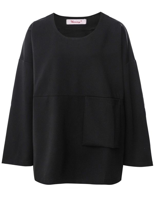 For a classic look, the long sleeve pocket top by Thanny is the ideal addition to any black top collection. Crafted from a stretchy fabric, this elegant top has a rounded neckline, full-length sleeves and a floaty fit that flares slightly at the waist. The final detail is the single hanging pocket to the front.